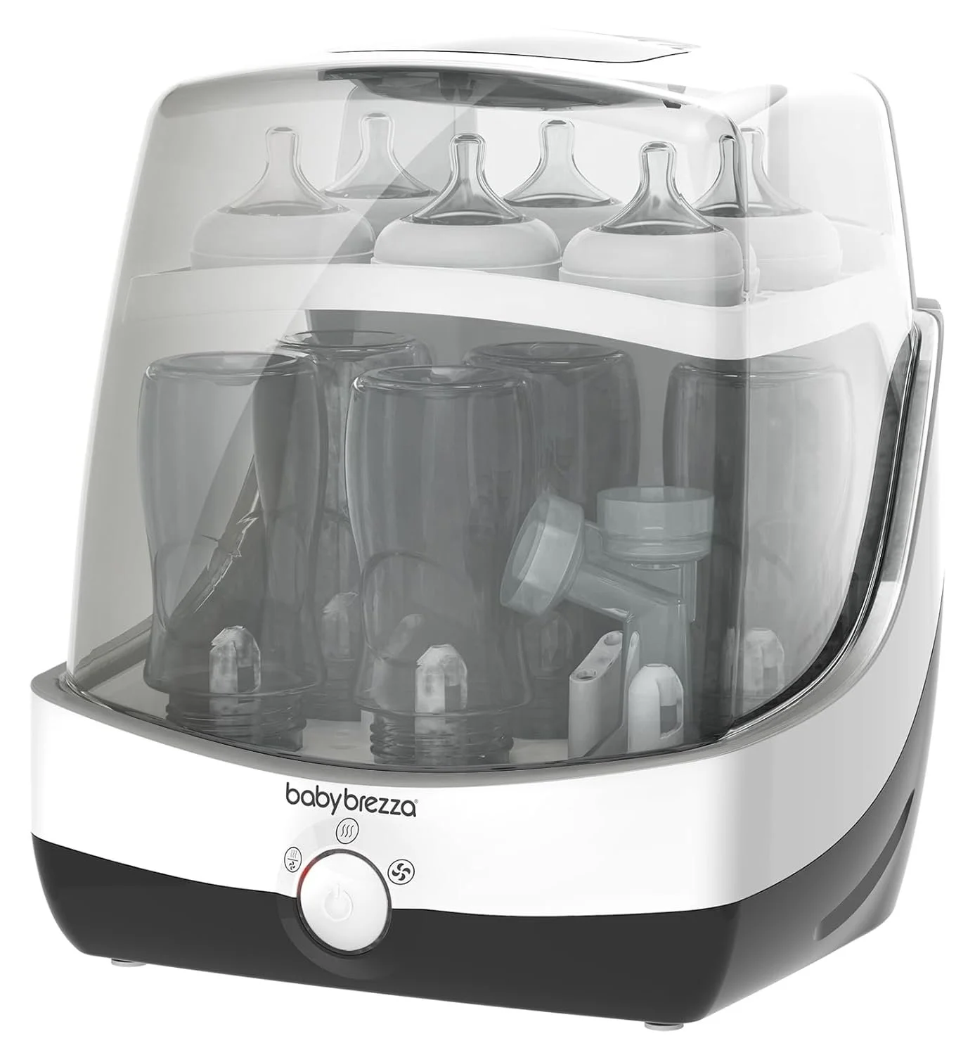 Baby Brezza 10 Minute Baby Bottle Sterilizer + Dryer. This is the best sterilizer and dryer! It's so quick, and the capacity is great! It also includes a water measuring cup on the back for easy access.